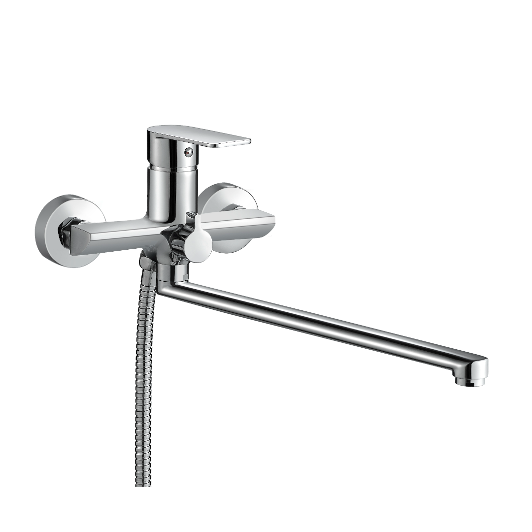 Смеситель для ванны с длинным изливом NENSA изготовлен из высококачественной латуни. Данный смеситель имеет однозахватную конструкцию, что позволяет легко и быстро настраивать температуру и напор воды одной рукой. Корпус смесителей изготовлен из прочной и долговечной латуни, а гальваническое покрытие обеспечивает стильный внешний вид и надежную защиту от коррозии.  Переключение между режимами «душ» и «ванна» осуществляется легким поворотом переключателя. Длина излива составляет 350 мм, что обеспечивает комфортное использование и достаточный радиус действия.
